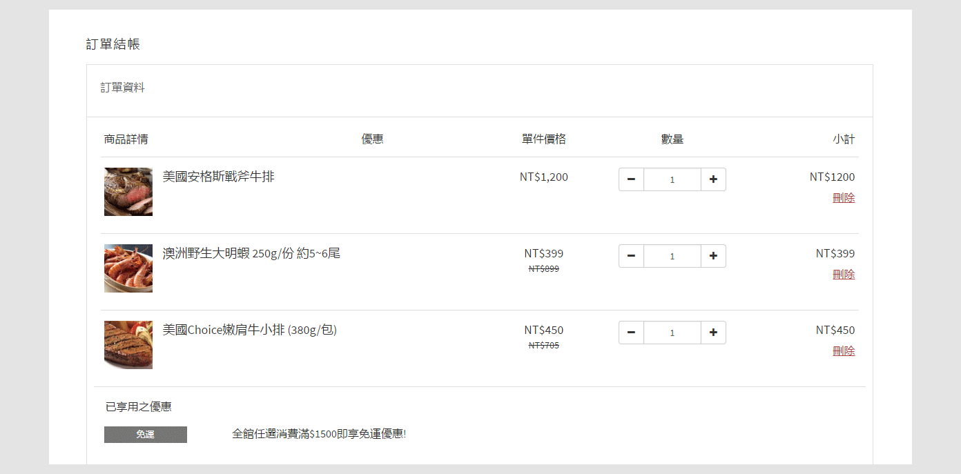 進入結帳頁面後,確認您所購買的品項、數量及金額是否正確。