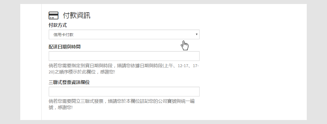 若您需指定到貨日期及時段,請於 " 配送日期及時間 " 的欄位填寫您的需求。