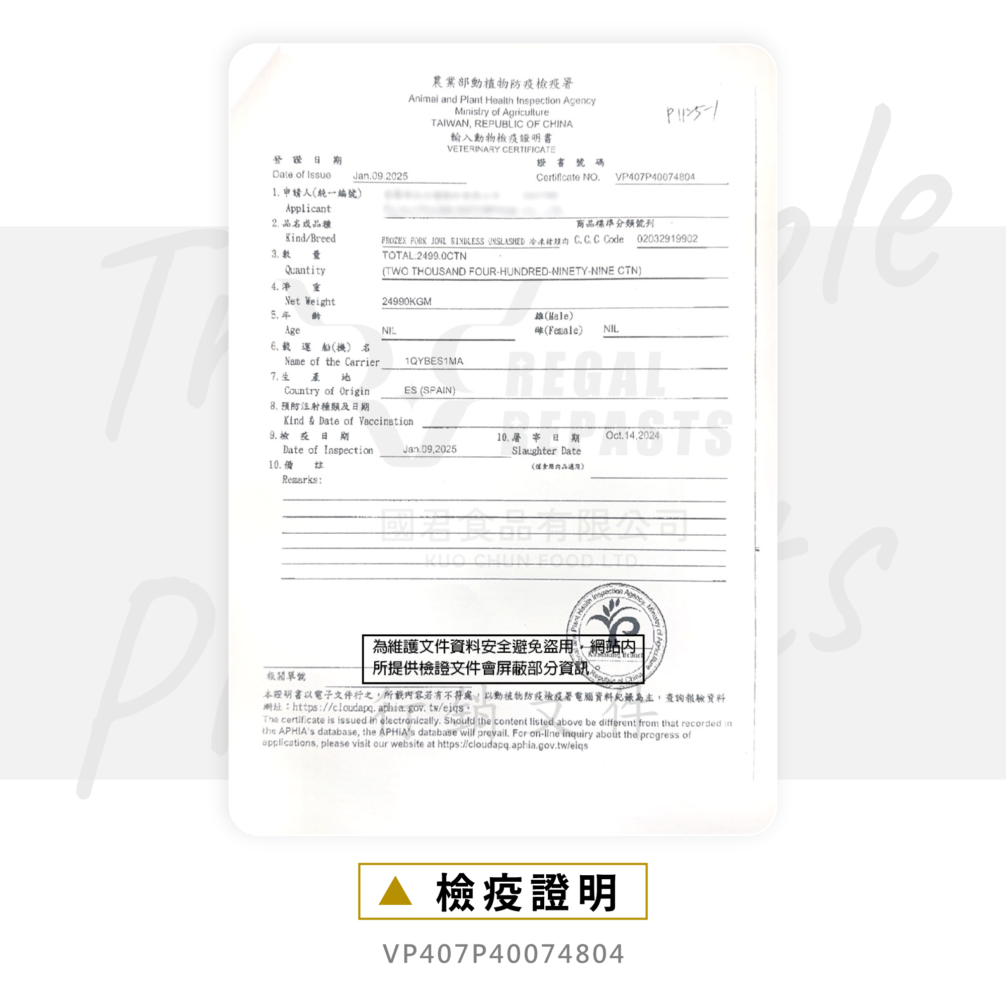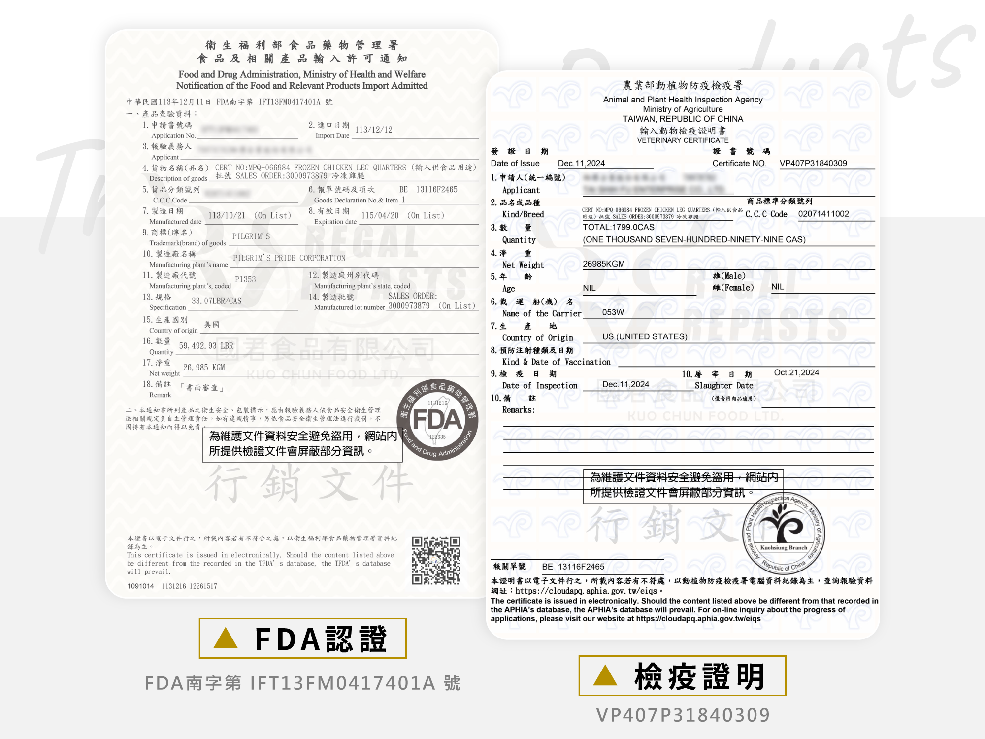 CERT NO:MPQ-066984 FROZEN CHICKEN LEG QUARTERS (輸入供食品用途) 批號 SALES ORDER:3000973879 冷凍雞腿