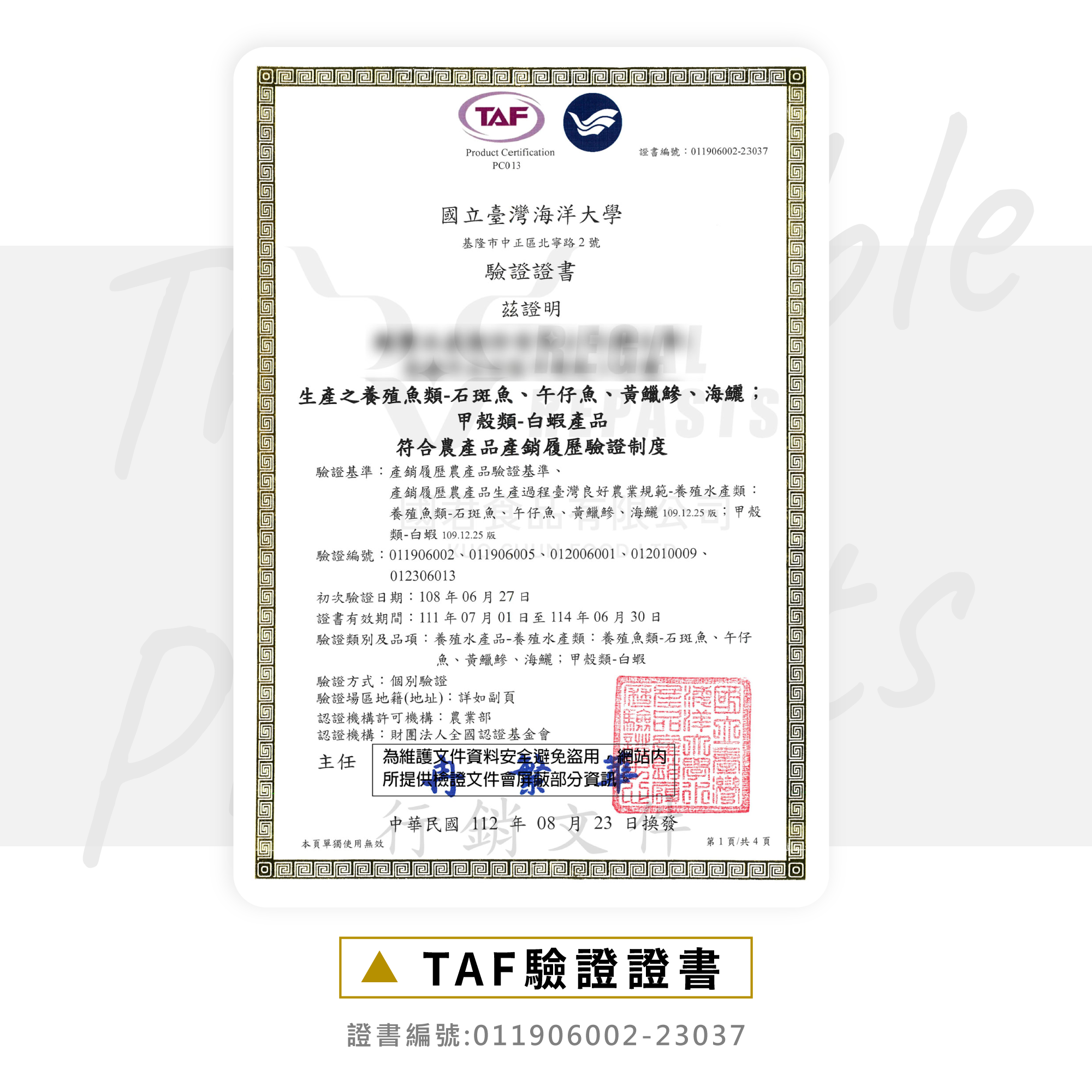 生產之養殖魚類-石斑魚、午仔魚、黃蠟鯵、海鱺;甲殼類-白蝦產品符合農產品產銷履歷驗證制度