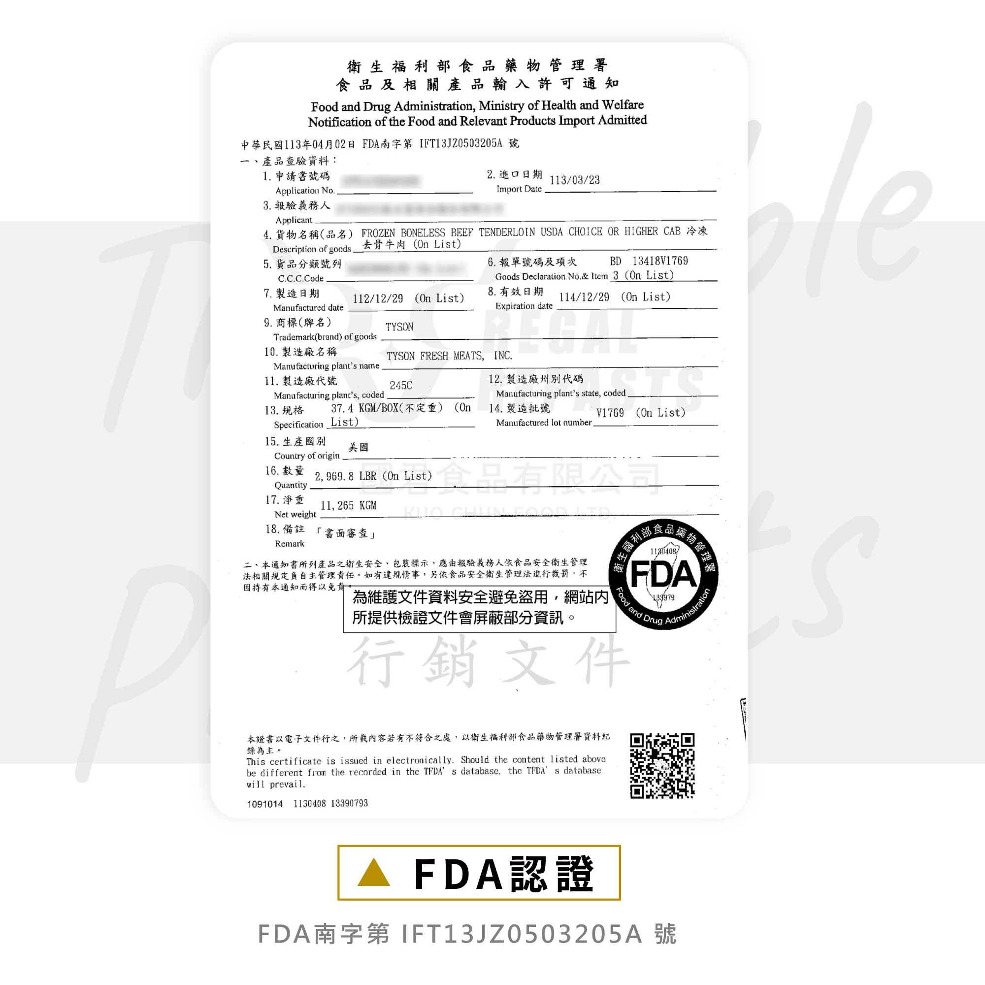 FROZEN BONELESS BEEF TENDERLOIN USDA CHOICE OR HIGHER CAB