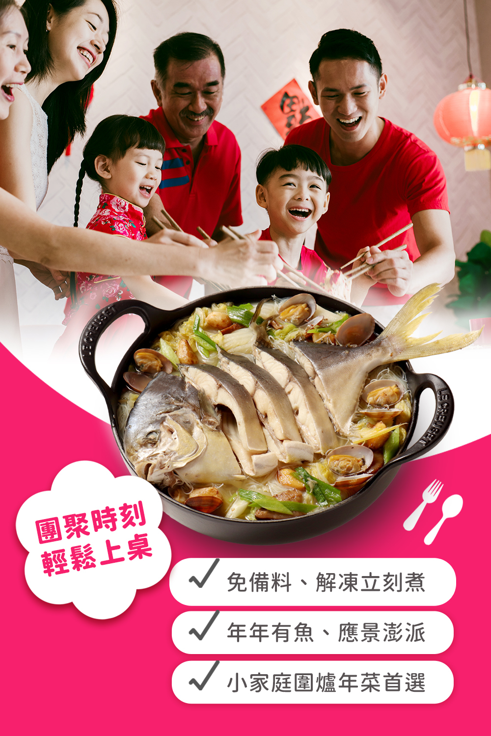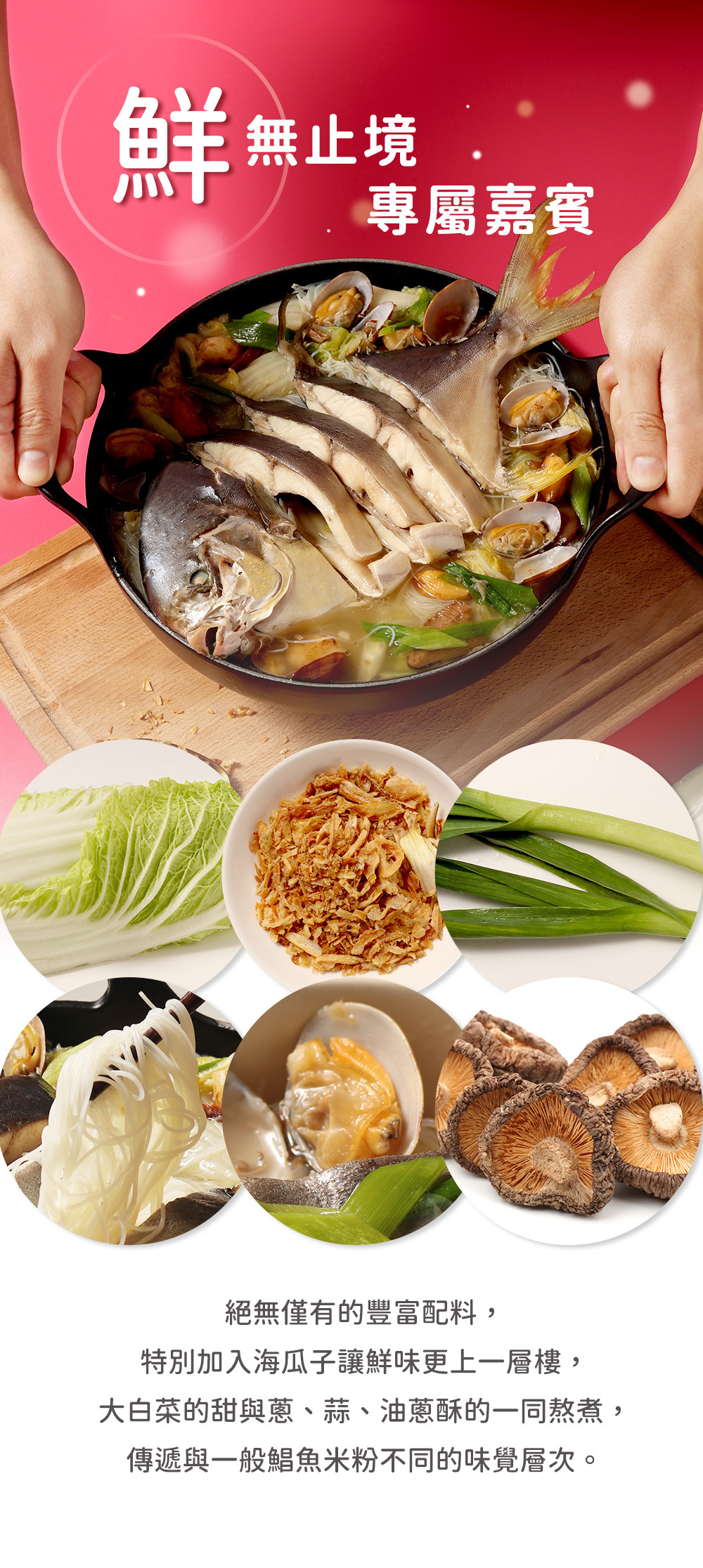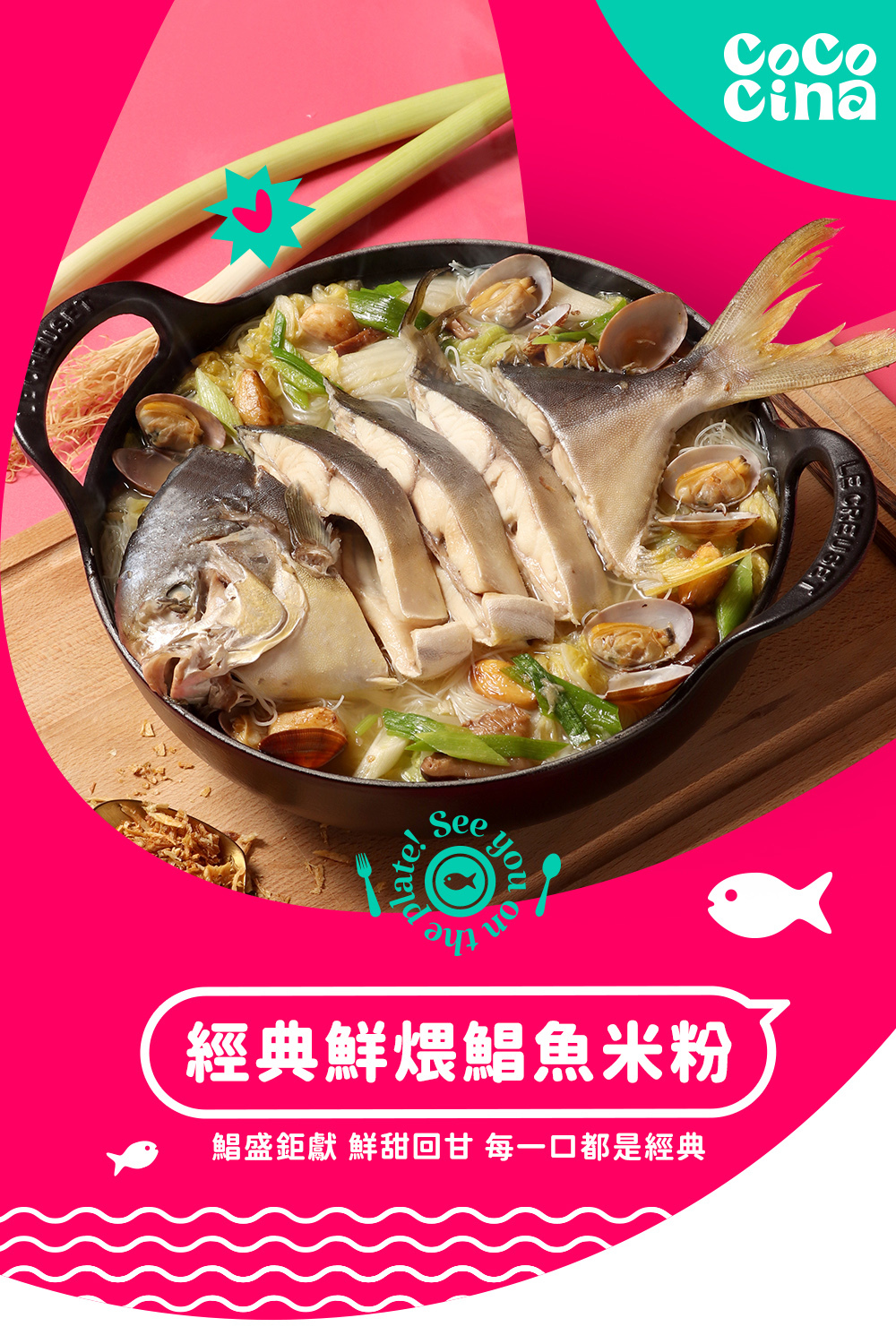 Cococina楽覓炊事經典呈獻過年餐桌上必備的台菜—經典鮮煨鯧魚米粉。選用自家養殖整尾的黃金鯧魚,再經過分切二清處理,不先炸或煎,保留最原味的新鮮,吃得也健康;佐以海瓜子等豐富配料,鮮甜回甘的湯汁經由米粉充分吸收,散發出清香的古早味。Q彈的魚肉、滑順的米粉、甘甜的湯頭,多重享受滿足味蕾,年菜怎能少了這一味?