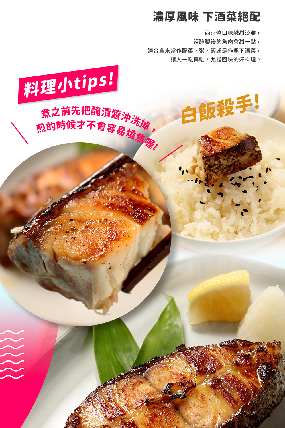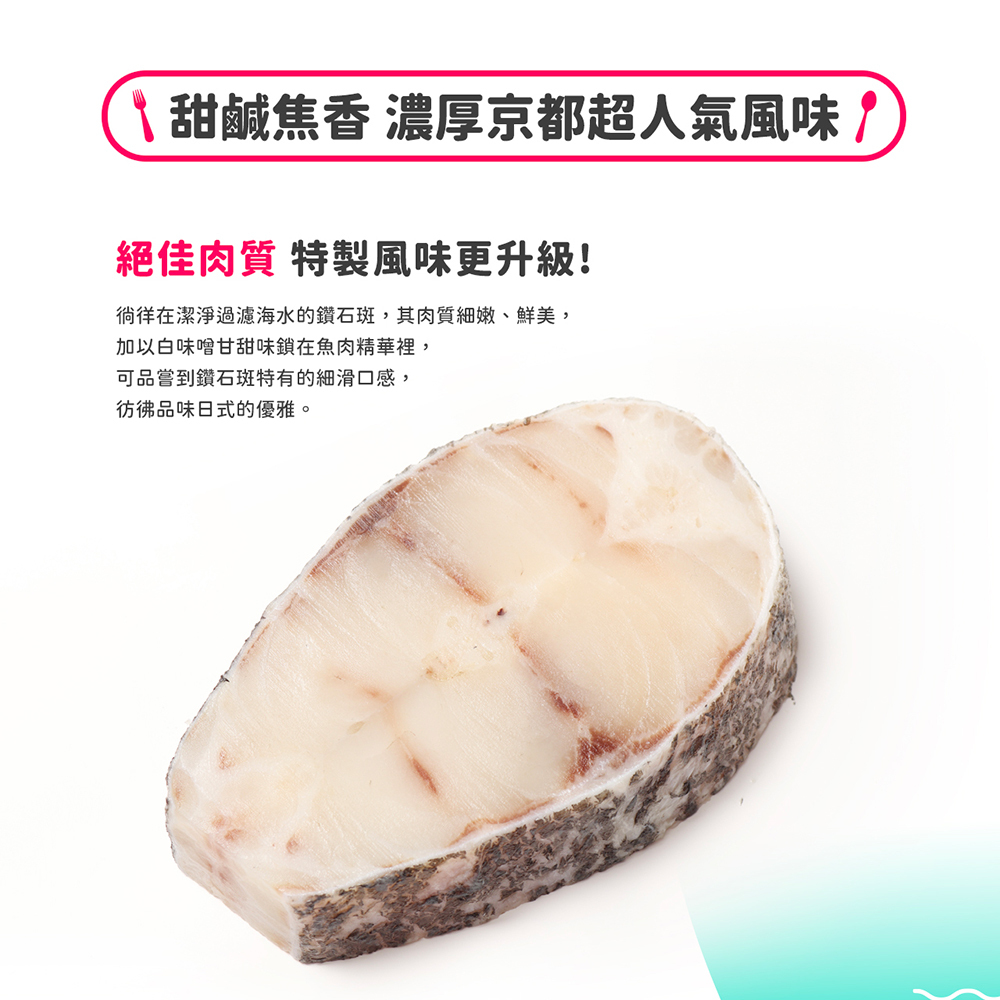 西京燒口味的鑽石斑,將白味噌甘甜味鎖在魚肉精華裡,可品嘗到特有的細滑口感,更適合拿來當作配菜,粥、飯或是作為下酒菜,讓人一吃再吃,允指回味的好料理。