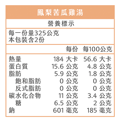 內容物:雞高湯(水、雞骨、豬骨)、去骨雞腿丁、鳳梨、苦瓜、蔭鳳梨(鳳梨、豆粕、鹽、甘草)、薑、鹽