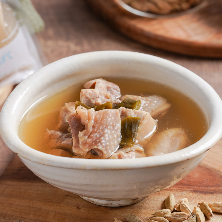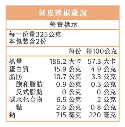 內容物:雞高湯(水、雞骨、豬骨)、去骨雞腿丁、剝皮辣椒、薑、蔥、糖、鹽