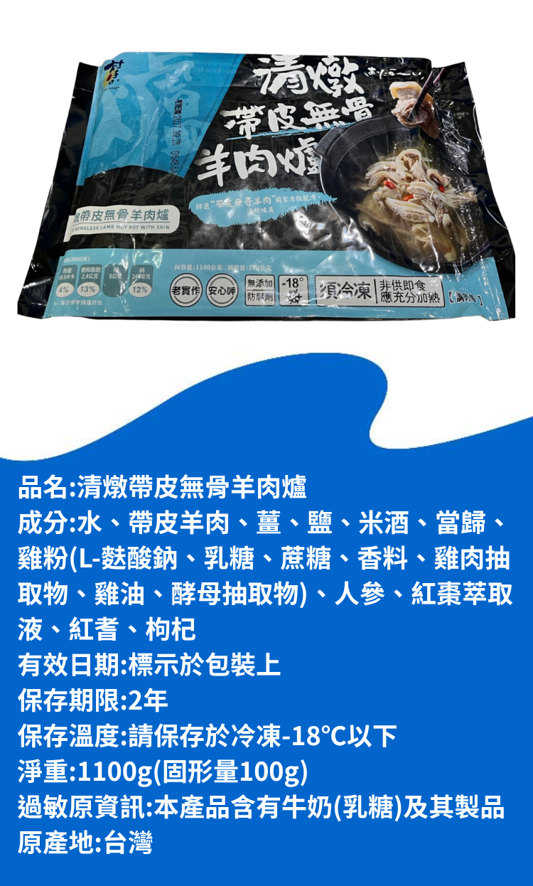 嚴選羊肉:特選帶皮無骨羊腩,肉質軟嫩不爛,羊皮Q彈富有膠質,無腥羶味。