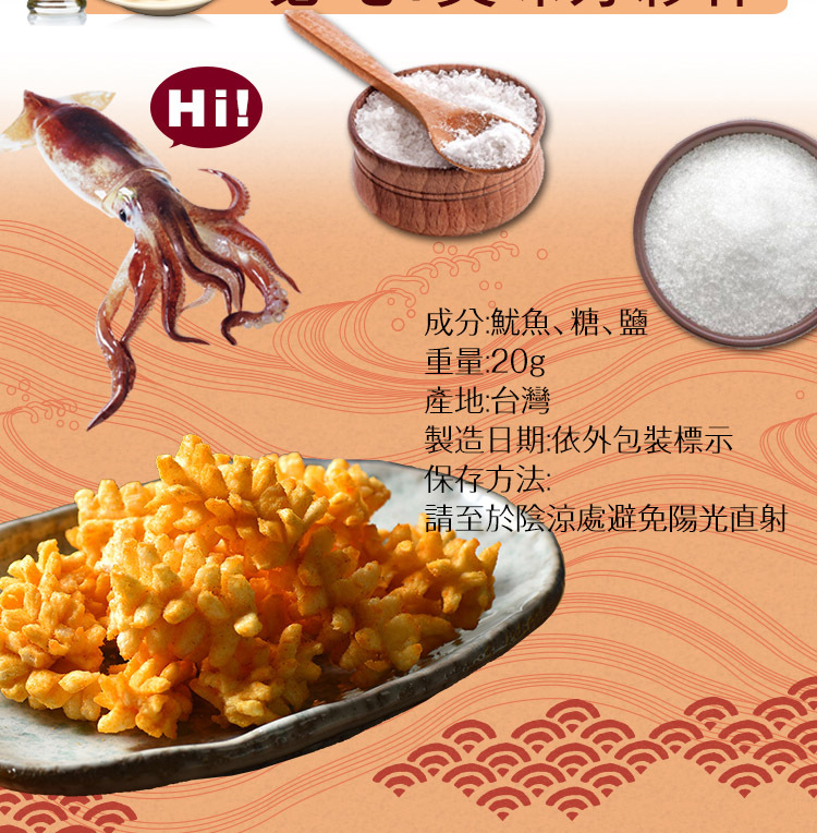 成份:魷米花、棕櫚油 、糖、鹽、調味粉(糖、食鹽、 L-麩酸鈉、香辛料(蒜粉、辣椒粉、洋香菜葉、胡椒粉)、醬油粉(純釀造醬油、麥芽糊精、砂糖、琥珀酸二鈉、5’-次黃嘌呤核苷磷酸二鈉 5’-鳥嘌呤核苷磷酸二鈉)、紅椒色素、蝦粉)
