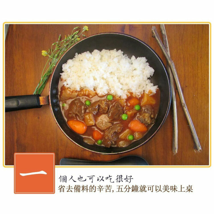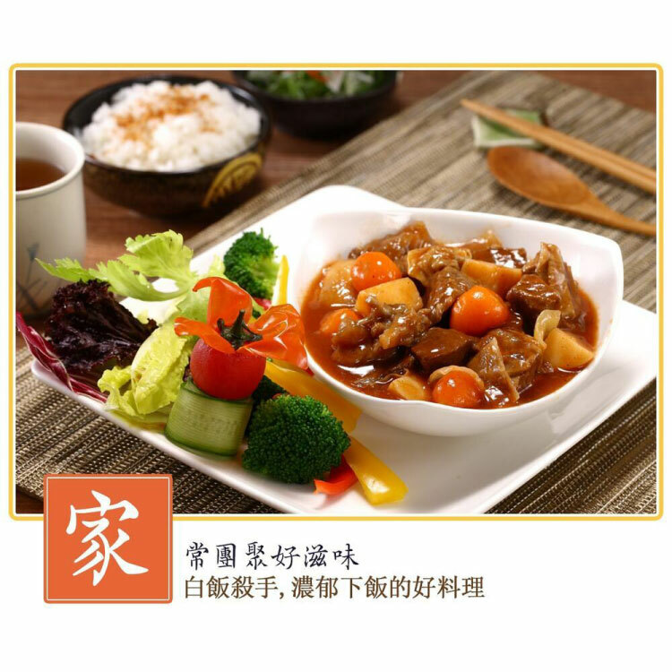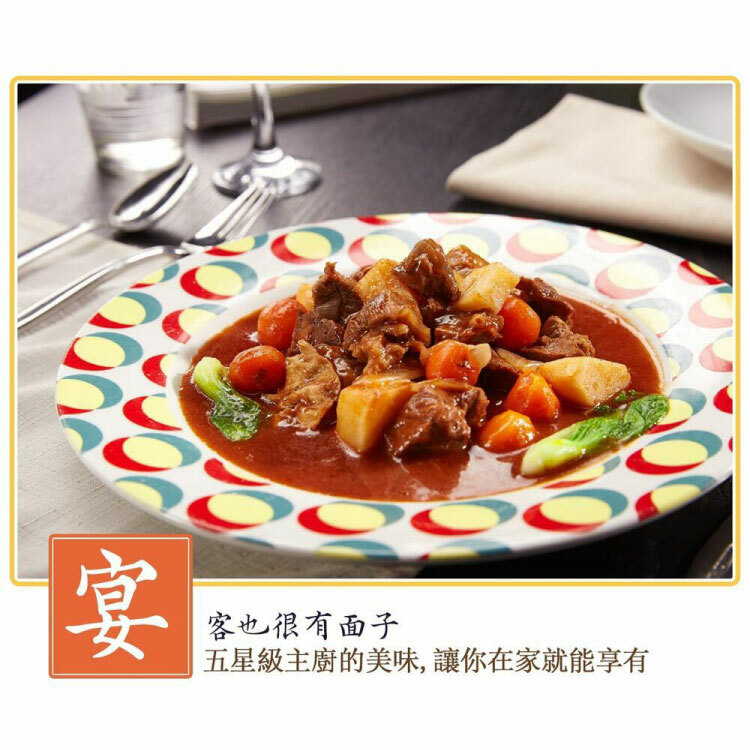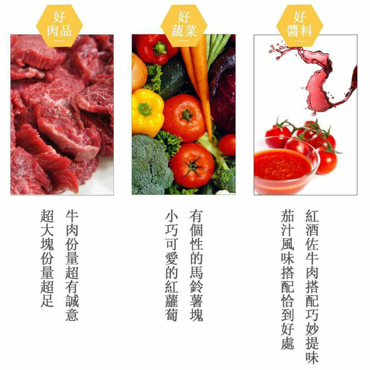 成份:水、牛肉(牛肉產地:澳洲巴拿馬)、番茄醬、洋蔥、馬鈴薯、紅蘿蔔球、糖、鹽、紅酒、胡椒粉、百里香、粘稠劑(乙酪化己二酸二澱粉)、調味劑(食鹽L-天門冬酸鈉、胺基乙酸、DL-胺基丙酸5'次黃嘌呤核苷磁發二鈉、5-鳥喋呤核苷破酸二鈉.琥珀酸二鈉)