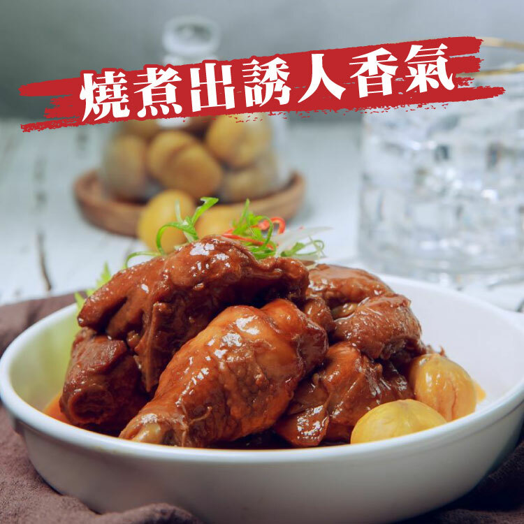 成份:雞腿、水、醬油、栗子、冰糖、蕃茄糊、薑、料理米酒、樹薯澱粉、香油、粘稠劑、素蠔油、烏酢、調味料、鹽